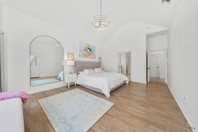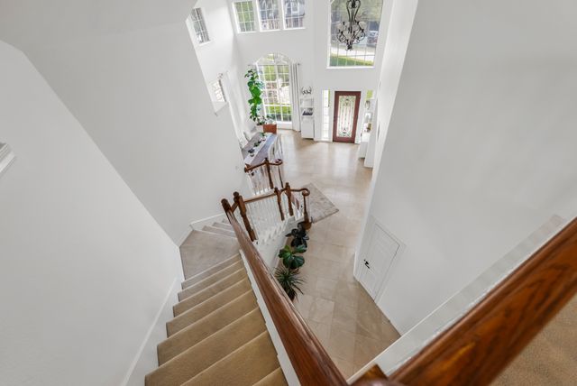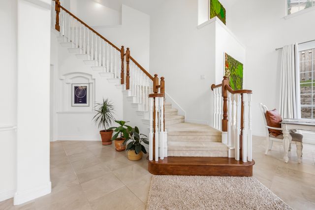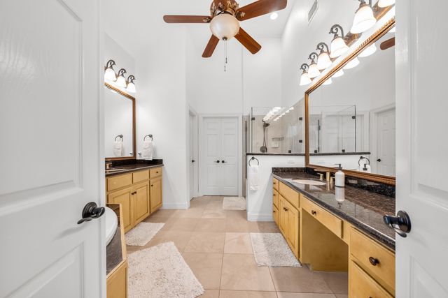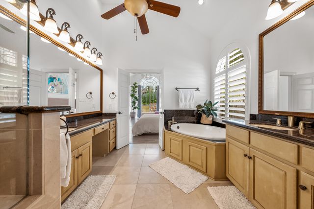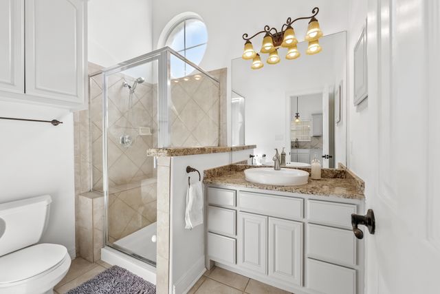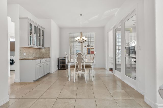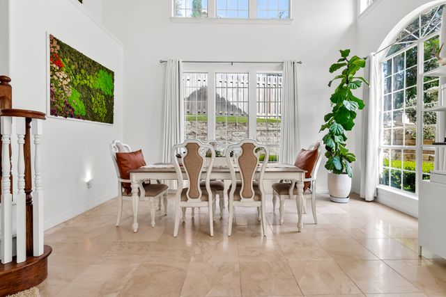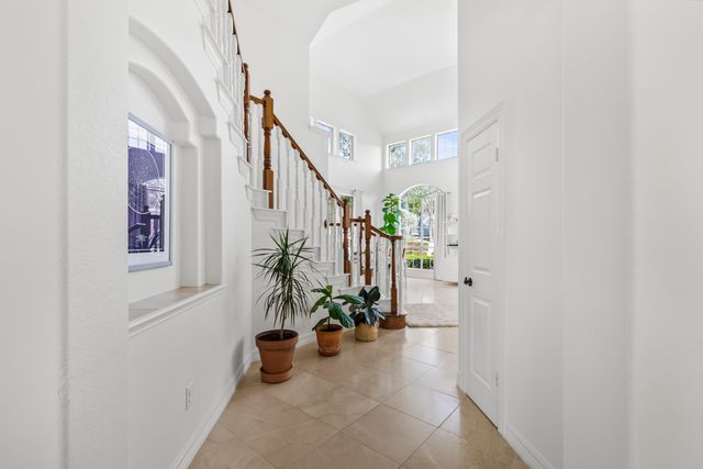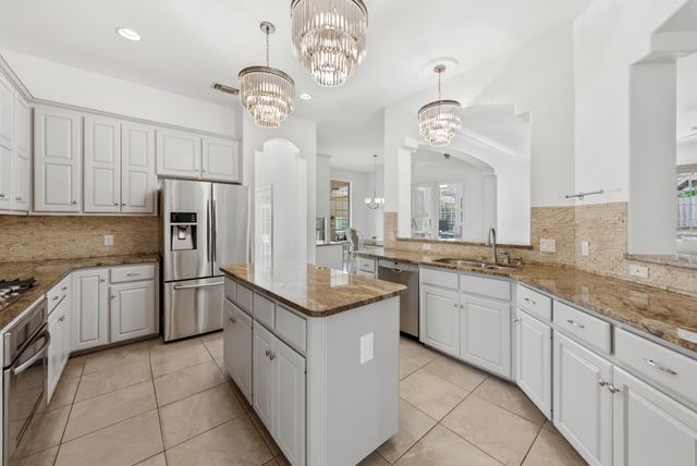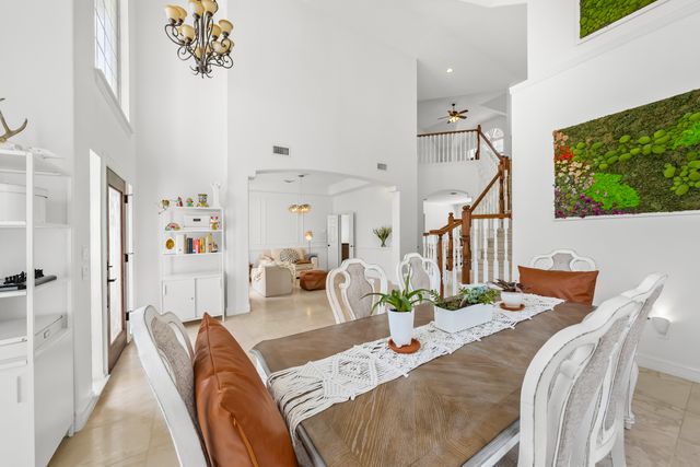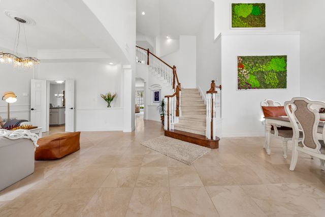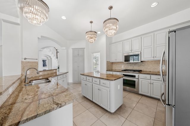 The open floor plan boasts natural travertine stone tile floors, high ceilings, and abundant natural light. The gourmet kitchen features stainless steel appliances, granite countertops, a center island, and a breakfast nook. Upstairs, you’ll find a game/media room and three oversized bedrooms with two full bathrooms. Downstairs, a half bath, a laundry room with built-in wood cabinets, and main living areas enhance convenience. The spacious primary suite includes an exterior door to the pool and an ensuite with french doors, dual vanities, a jetted whirlpool bath, and a large shower.