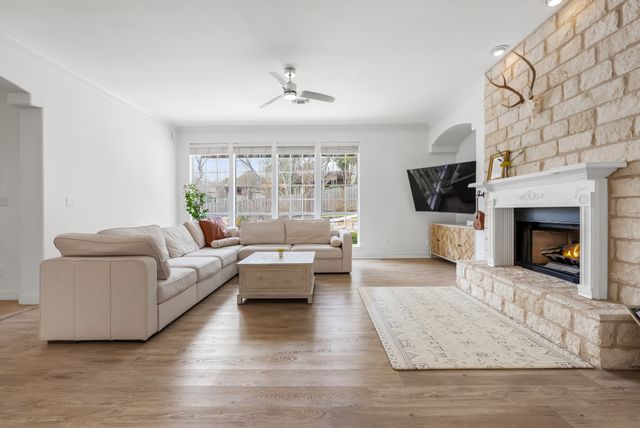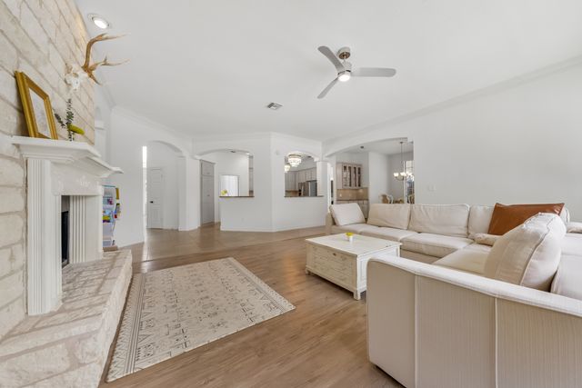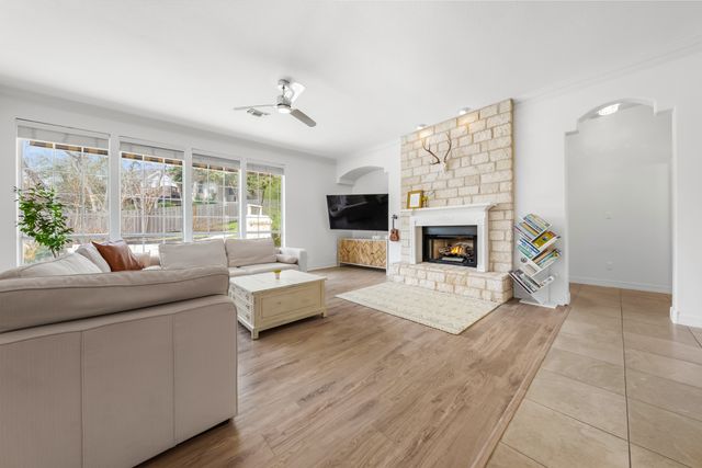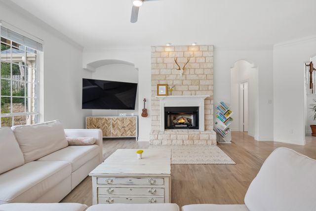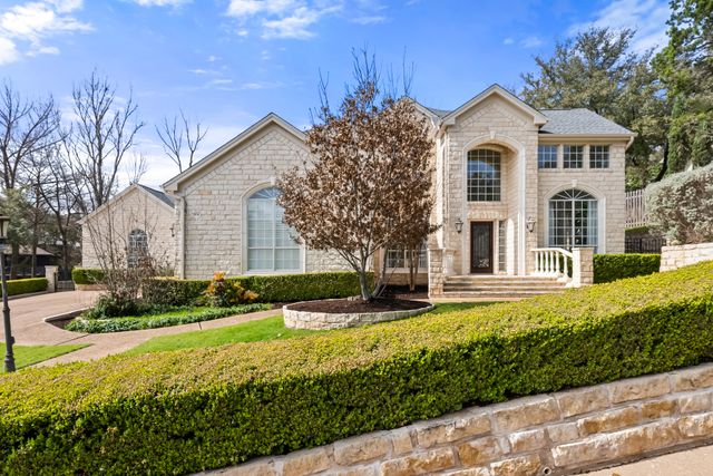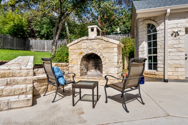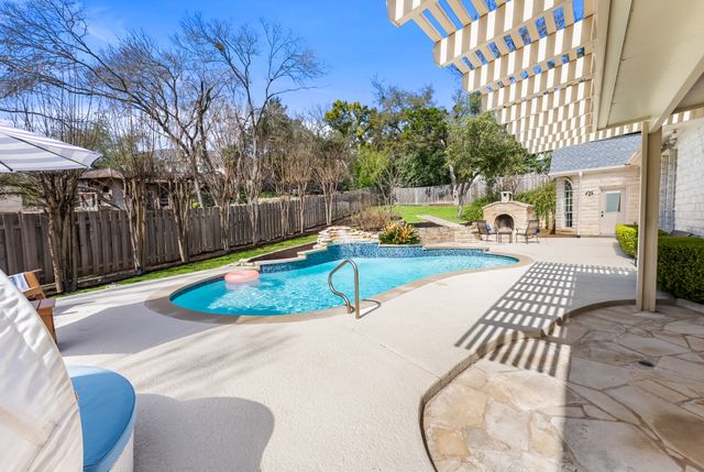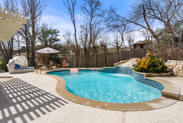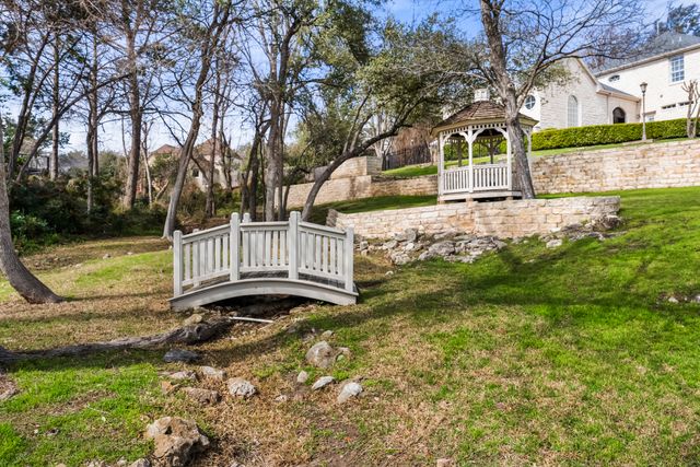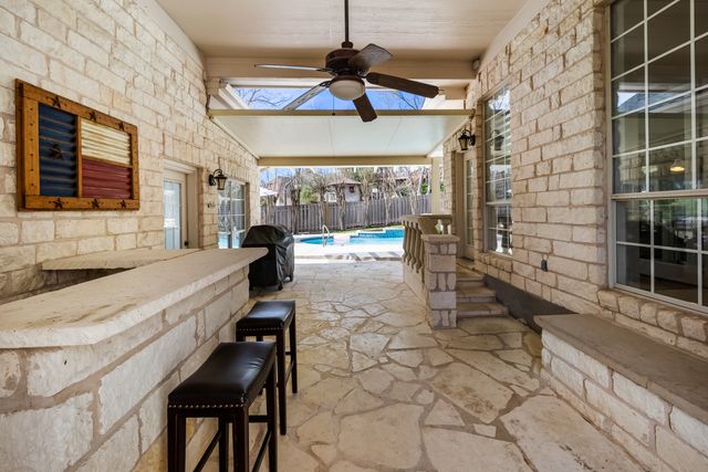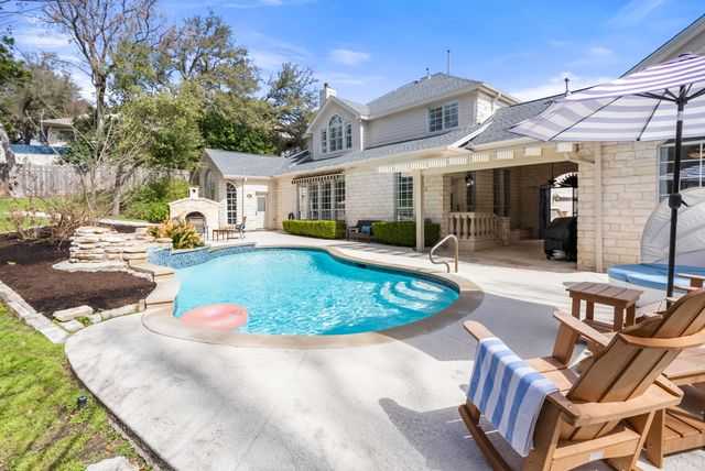 Welcome to 504 Duck Lake Drive, a stunning 4,363 sq. ft. home in the heart of Lakeway, offering luxury and versatility. This 5-bedroom, 4.5-bathroom residence includes a detached casita that serves as a fifth bedroom with its own full bathroom, full kitchen, and separate entrance—ideal for guests or extended family. The property sits on a large corner lot with a gazebo, decorative bridge, and mature trees. The backyard oasis features a pool with a rock waterfall, a patio with a fireplace, a covered patio with a bar, a casita with a bedroom, full bathroom and kitchen, and a private fenced area.
